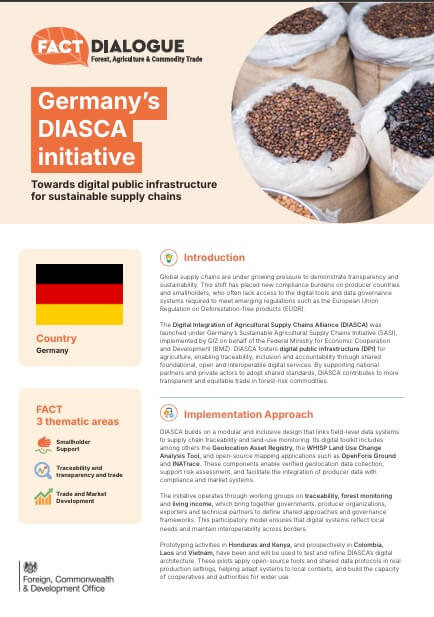 Building on this, the Digital Integration of Agricultural Supply Chains Alliance (DIASCA) brings public and private partners together to co-develop open, interoperable digital infrastructure that makes agricultural supply chains more traceable, inclusive, and sustainable across multiple countries — contributing to the objectives of the Forest, Agriculture and Commodity Trade (FACT) Dialogue.